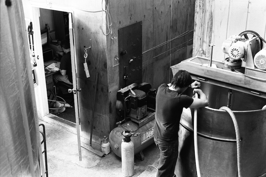 Paul Croucher cleans the mash tun as Nigel Gregory works in the office.