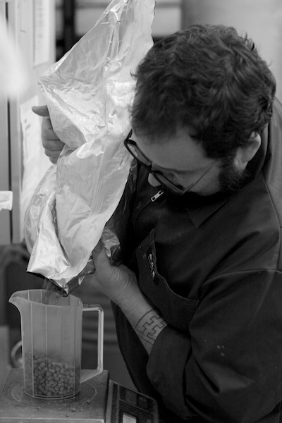 Kieran Haslett-Moore weighs hops for adding to the boil.
