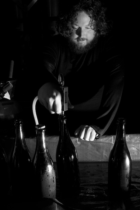 Dan Lord fills a bottle with Funk Estate Super Afro-disiac. Massey University, July 14, 2013.