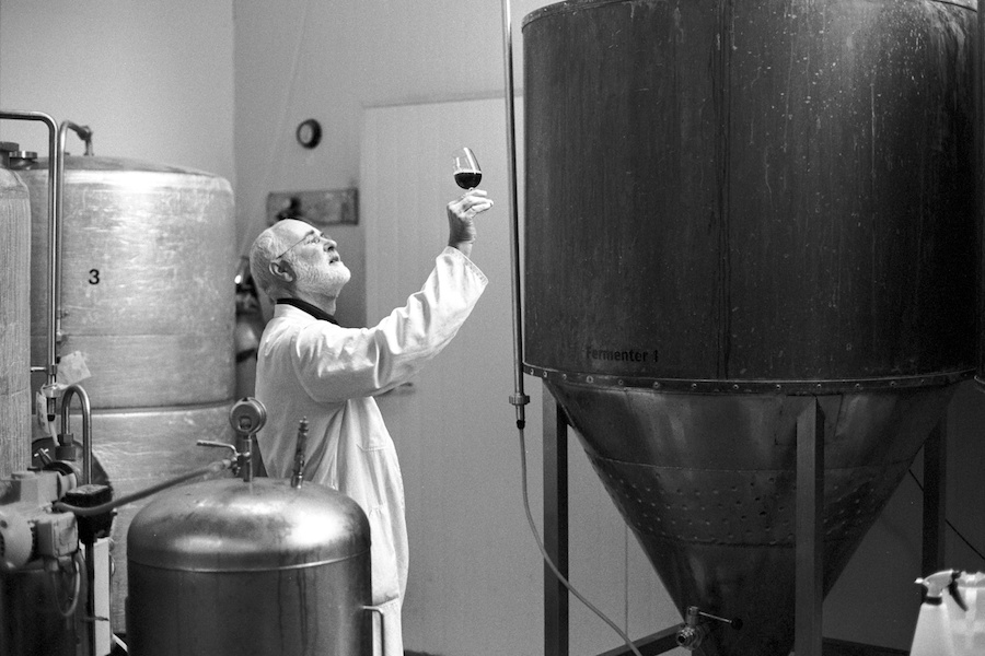 John Duncan of Founders Brewery examines the clarity of a beer after filtering. Nelson, 2009.
