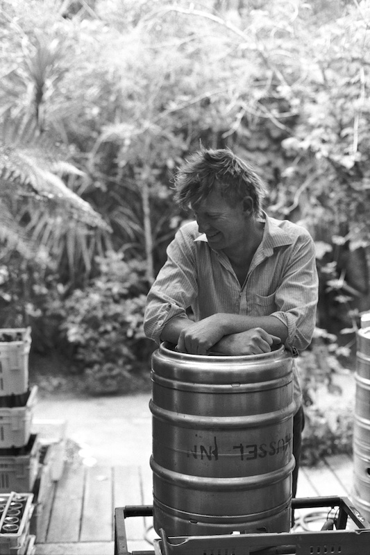 Reuban Lee relaxes while washing kegs at The Mussel Inn, Onekaka, Golden Bay, 2009.