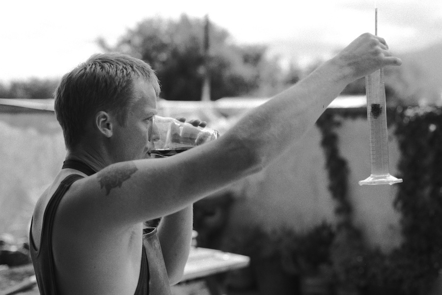 Mat Elmhirst of The Monkey Wizard Brewery examines the wort while enjoying a taste. Riwaka, 2010.