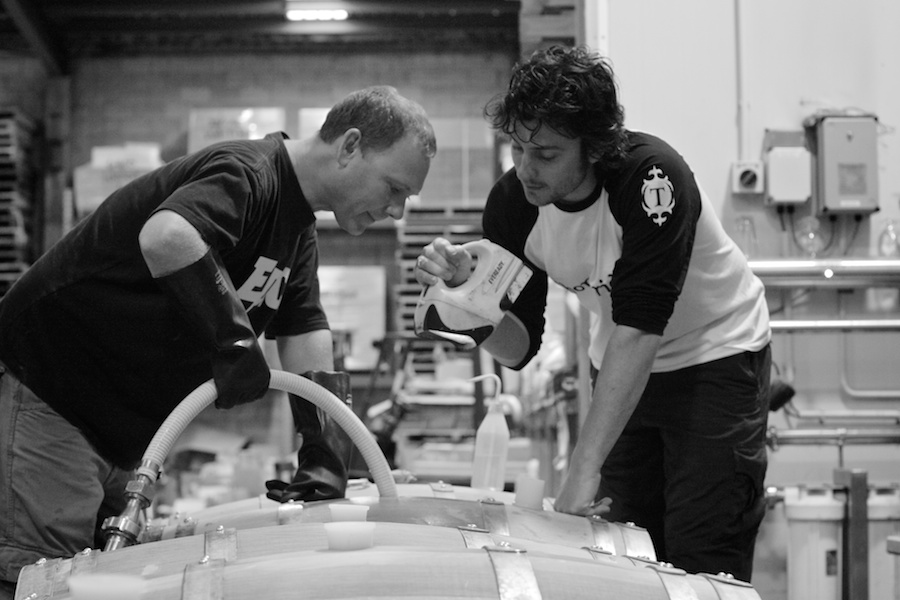 Luke Nicholas of Epic Brewing and Kelly Ryan of Thornbridge transfer beer to barrels. Auckland, 2010.