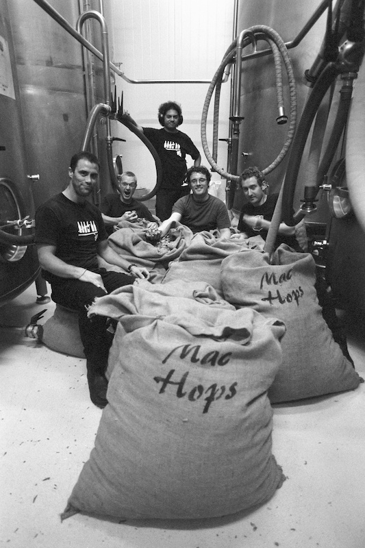 Ally Clem and his team of brewers at Mac's Brewery with the 190kg of the fresh hops for the final annual brew of Brewjolais at Mac's Wellington brewery. The hops were the first hops of the season, harvested in Nelson that morning and driven by Ally back to Wellington to be added to the brew at 6:10pm. Wellington, 2010.