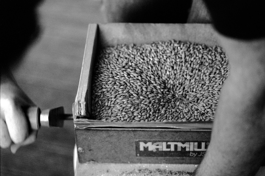 Malt being milled by hand for a Yeastie Boys test brew. Seatoun, Wellington, 2009.