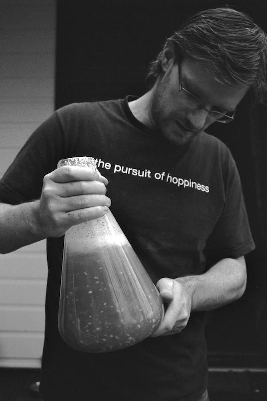 Stu McKinlay with yeast ready to add to a Yeastie Boys test brew. Seatoun, Wellington, 2009.