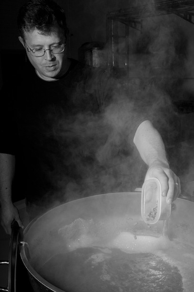 Chris Mills adds hops to the boiling wort. Kereru Brewing, Upper Hutt, 2013.