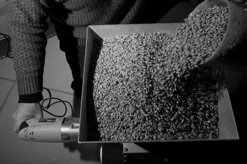 Chris Mills mills the grain for a brew. Kereru Brewing, Upper Hutt, 2013.