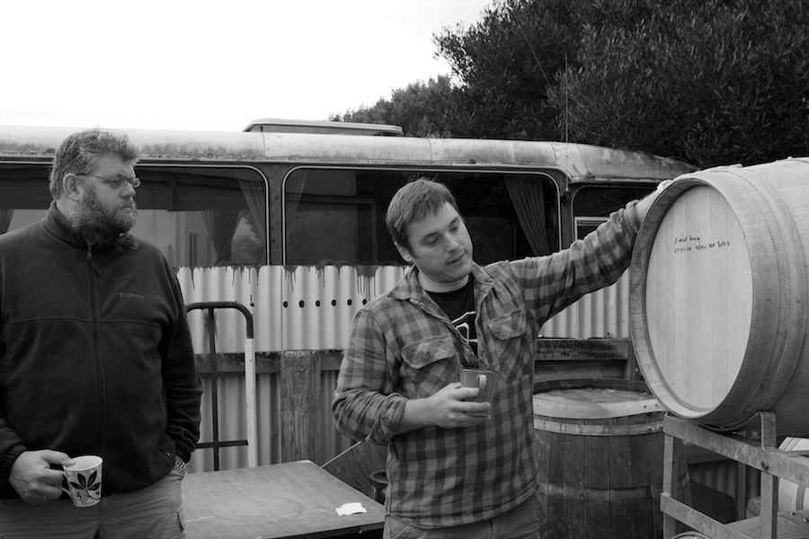 Søren shows Kjetil his recently barreled imperial stout, Bumbaye while discussing barrel-aging beers.