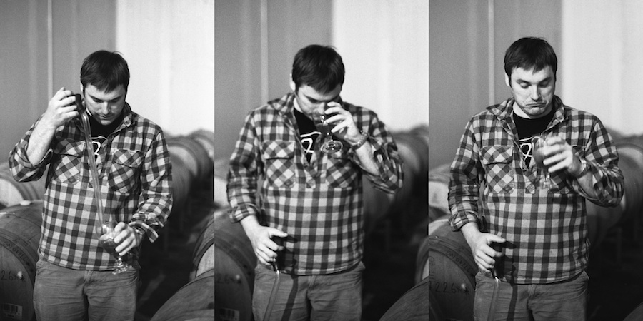 Søren tests a sample from a barrel of his Flanders Red sour ale.
