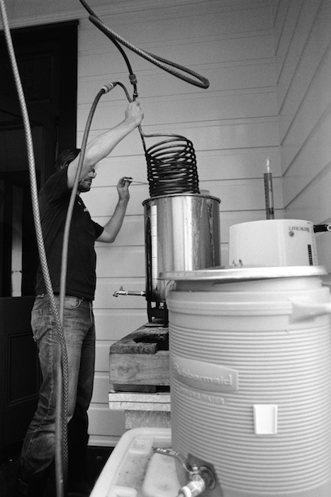 Once the wort has been boiled it must be cooled as fast as possible to minimise the chances of bad bugs breeding. Stu runs cold water through a copper coil to bring the temperature down.